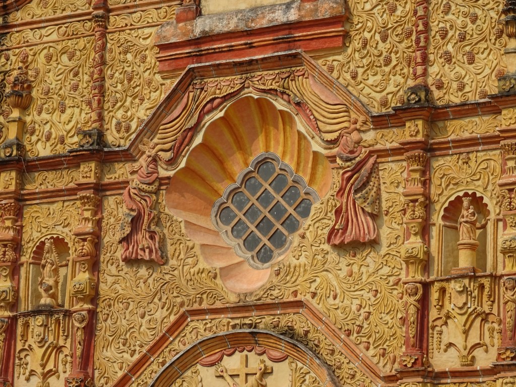 We stopped off in the quaint town of Jalpan at the Jesuit mission church – an amazingly ornate exterior and leafy little cloisters alongside. The first of the Jesuit churches; (we saw 2) but there are 7 tucked into these hills.