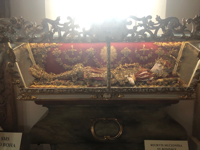 We are staying in a very nice big apartment, so good you could live here and it’s a cute town, bigger than Mikulov and hilly but with good  onion dome churches, and the above St Boniface’s body in a church with lacy sh*t all over, but you can see the bones. Interesting.