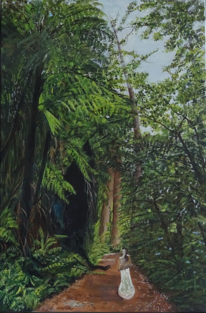 The painting is based upon the local myth of a young bride (Tuhi-karaparapa) who travelled from Tarawera to Ohinemutu (Rotorua) via the beautiful Tikitapu (Blue lake) path. She was set upon and killed by a Taniwha called Kataore who had got ‘out of control’ . In Maori myth a taniwha is a supernatural creature that is often represented by a serpent or a dragon. This tanawha lived in a cave on the mountain between the blue and green lakes near Rotorua. I represented the taniwha with the dark figure hiding and partly obscured by the ferns but with a talon reaching out as a warning.
